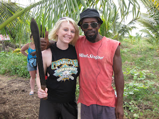 Today was a very long day...in a good way. We were set to leave this morning a little later than planned but we made it work. We jumped on a boat that was set to pick us up from our hotel and drove a short way down the beach so we could meet up with Rondell, the captain of our riverboat tour. We met up with Rondell and headed walked a short distance to where his boat was. His glass bottom boat. Normally I would not allow myself to be put into water with something as dangerous sounding as a glass bottom boat but it was interesting to see the ocean from a different perspective. We headed up the river quite a ways and went to the Royal Palm Reserve which is pretty much a National Park type of thing. We had to walk about a mile down a dirt road but we made it somehow : ). Once we were there we were taken down wooden walkways around the park. We learned about the animal life that lived in the reserve and many of the plants. It was really cool being able to see such lush plant life in such a small area because it's very different from the hardwoods back home. At the reserve we were able to see a crocodile, or we attempted to see him but he wasn't so happy about that. We went back to the boat and all of the sudden a man started yelling to Rondell to stop so Rondell pulled up on the shore. At the time it seemed like a really bad idea just because almost all of us were very hungry and just wanted to get outta the boat. But a couple of us went ashore anyway and found out that the man, Norman Scarlett, was a coconut farmer and he was just going to show us around. We were all in flip flops so we couldn't go to far in all the brush but when we got to a tree he showed us how it was done. He took his maceti and started chopping down coconuts. After he was done they chopped off the tops and had us drink the water that is inside of the coconuts and it actually was not bad at all. It tasted just like water but there was an extra little zip to it. He also chopped one down that could be eaten because the insides of the ones with water are just hollow. So after that experience we came back to the hotel and had lunch. Our group split up after that and some people went snorkeling and some went shopping. I decided to go snorkeling. In one of my earlier posts I said that I wanted to defy one of my fears, well today was that day. I am afraid of the ocean and before we left I had told everyone that they would not get me to snorkel. I decided today that if I wanted to make the most of this experience I would have to snorkel. I have to say though that I was terrified the entire time I was in the water. Rondell and one of his crew members were nice enough to come in the water to make me a little more comfortable. Rondell took me in and helped me around and showed me a lot of plants and fish. I think my favorite one was the sea cucumber just because it is so weird looking. We swam around there for about 30 minutes and then hopped back on the boat to go back to the hotel. When we got back we all got ready and went out to eat at Cosmos where Nicole said there was excellent lobster. I decided to just get the fried fish but I was able to try the lobster and it was indeed amazing. I have fallen in love with some of the food here. There is some vegetable thing here that tastes a lot like coleslaw but it is so much better. I also have fallen in love with the bread because it's so rich and filling that you can eat it as a meal itself. Well I"m really tired now and we have to be outta here by 6 a.m. tomorrow to make it to the tech college in Seaford town. Until then : )